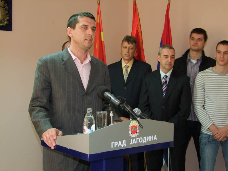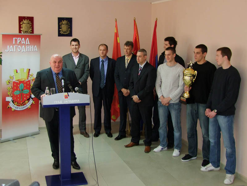„Захваљујући овом великом успеху кошаркаша Јагодине, поморавска престоница сада има 4 прволигаша“, рекао је градоначелник Јагодине Драган Марковић Палма и поновио да се улагање локалне самопураве у спорт исплатило и вратило кроз овај резултат. „Поред женског рукометног и женског кошаркашког клуба, фудбалера Јагодине којииграју у Суперлиги Србије, сада су и наши кошаркаши постали Прволигаши,и то је веома значајно за град. Ми ћемо направити базу у свим школама и свим местима, разговарађемо са професорима и наставницима да се деца усмеравају на оне спортове који су у првој лиги. Показали смо да у овом граду, кад се нешто хоће, то може да се реализује“ рекао је Марковић и овом приликом посебно се захвалио потпредседнику клуба Ивици Стеванићу, који је водио клуб. Градоначелник Јагодине је нагласио , да на путу до овог великог успеха, кошаркаши Јагодине нису имали никакве посебне захтеве, нити су тражили посебна финансијска средства, али да су данас сци играчи награђени са две просечне плате, за успех који су постигли. Марковић је оценио да је значајно и то што РТС директно преноси утакмице овог ранга, што ће бити добра прилика да се рекламира град, који је данас водећи туристички центар у Србији.“ Наш прослављени кошаркаш, Дејан Бодирога, је мој добар пријатељ и ја ћу га позвати да дође у Јагодину, и ако пристане, биће почасни председник клуба.Овај пехар који су освојили јагодиски кошаркаши, подсећа ме на пехаре који осваја Новак Ђоковић и симболизује на велики успех, и пошто је ово први пехар који је овај клуб освојио, следећи ће бити у збирци са осталим спортским признањима, овде у Скупштини града“, нагласио је градоначелник Јагодине, Драган Марковић Палма.